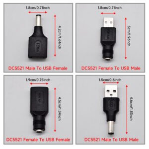 Commonly USB to DC Power Adapter, DC 5.5×2.1mm male Connector to USB Female, DC 5.5×2.1mm Female Connector to USB male, DC 5.5×2.1mm Female Connector to USB Female, DC 5.5×2.1mm male Connector to USB male.