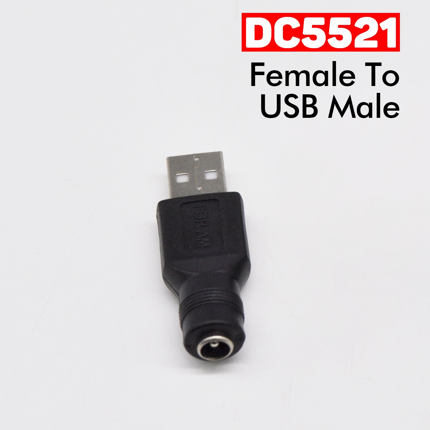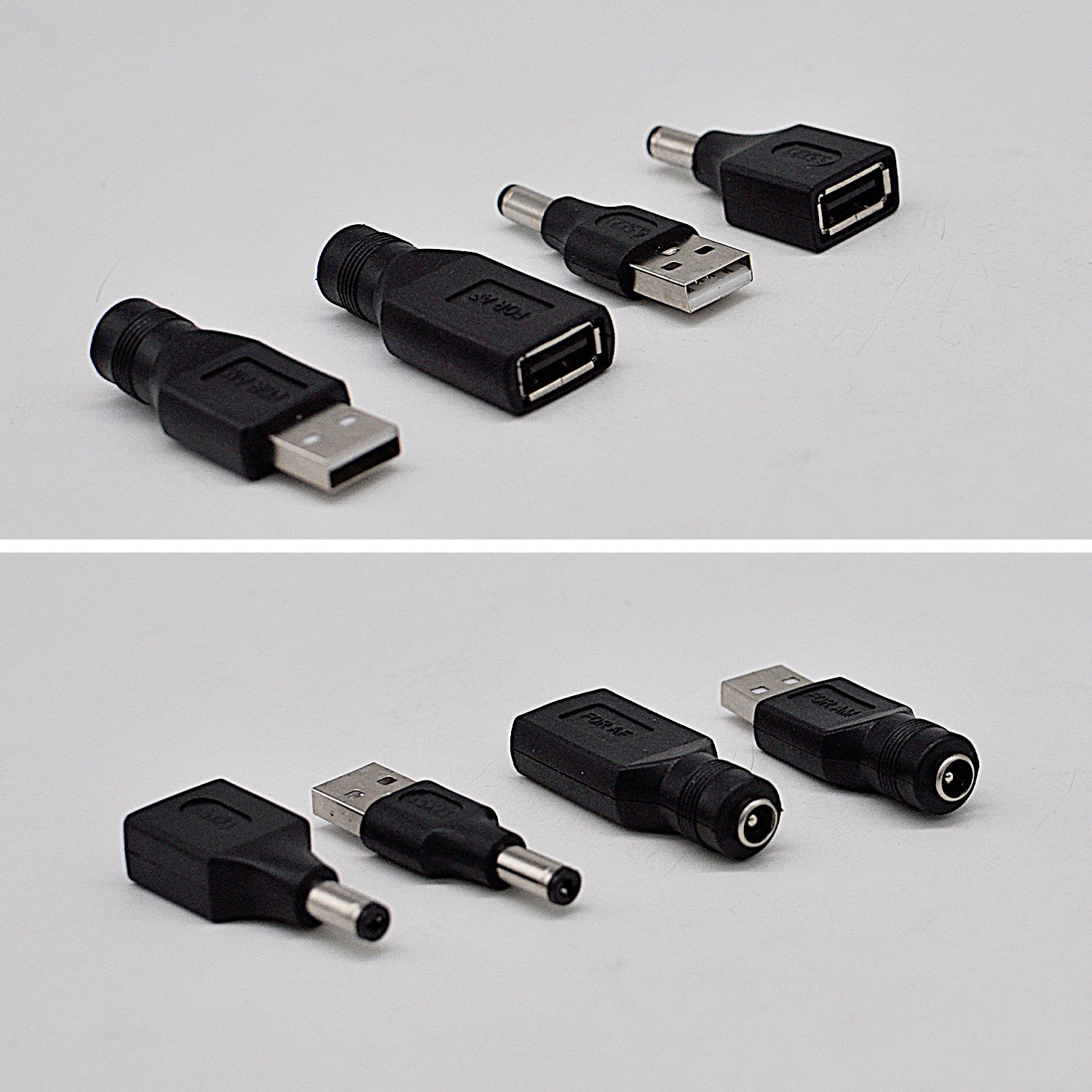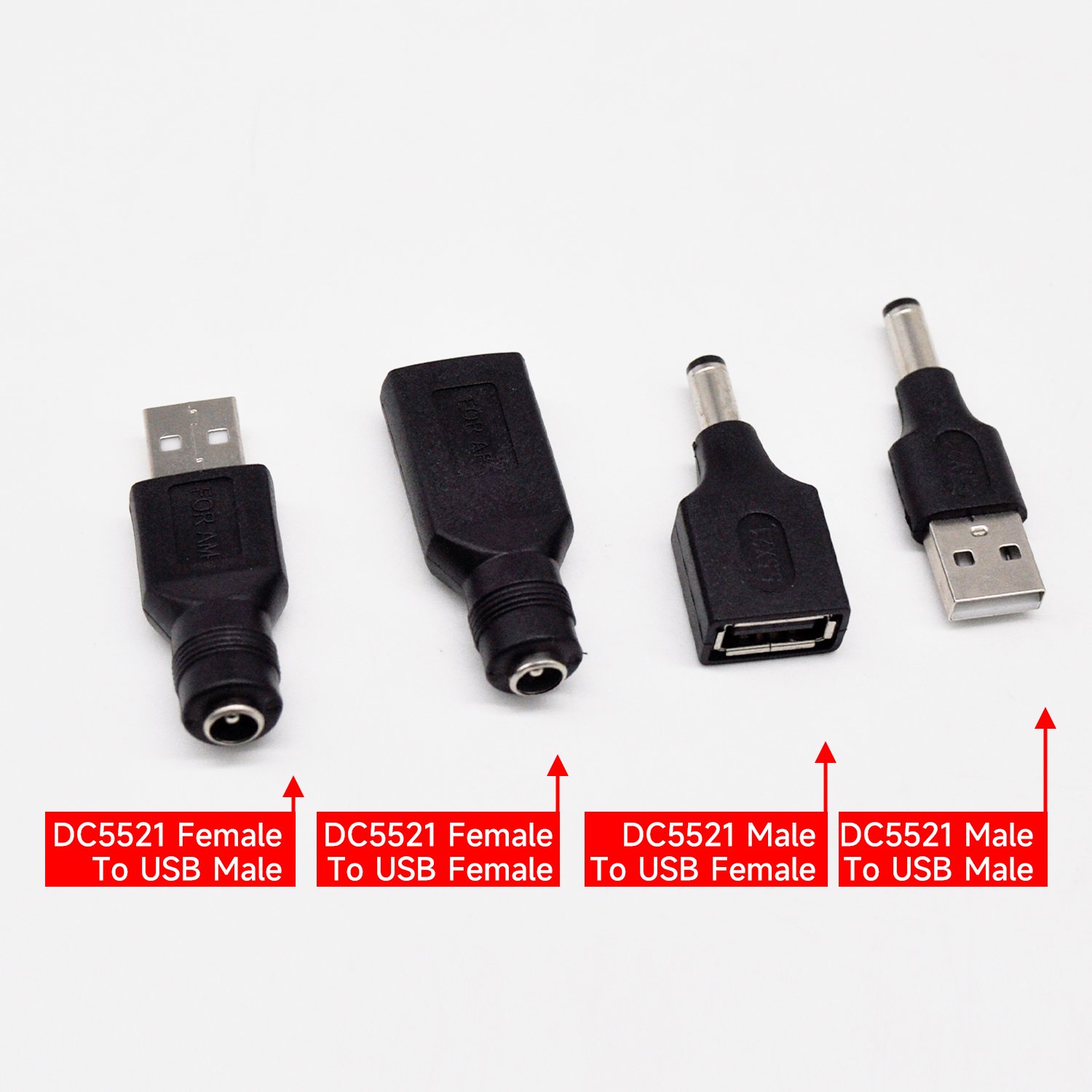 Commonly USB to DC Power Adapter, DC 5.5×2.1mm male Connector to USB Female, DC 5.5×2.1mm Female Connector to USB male, DC 5.5×2.1mm Female Connector to USB Female, DC 5.5×2.1mm male Connector to USB male.